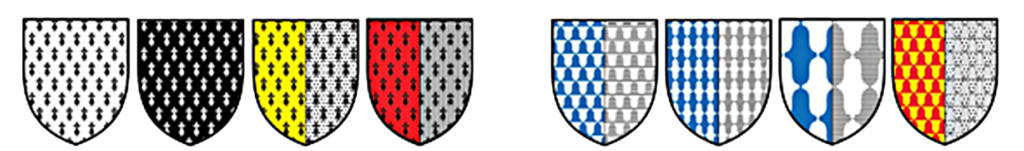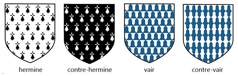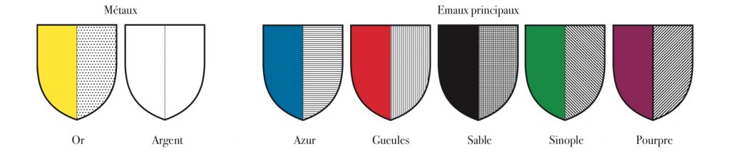 Le blason peut être composé de trois familles d’“émaux” : les couleurs, les “métaux” (or et argent), et les “fourrures” : l’hermine comme dans les armoiries de la Bretagne, et le vair (fourrure de l’écureuil).