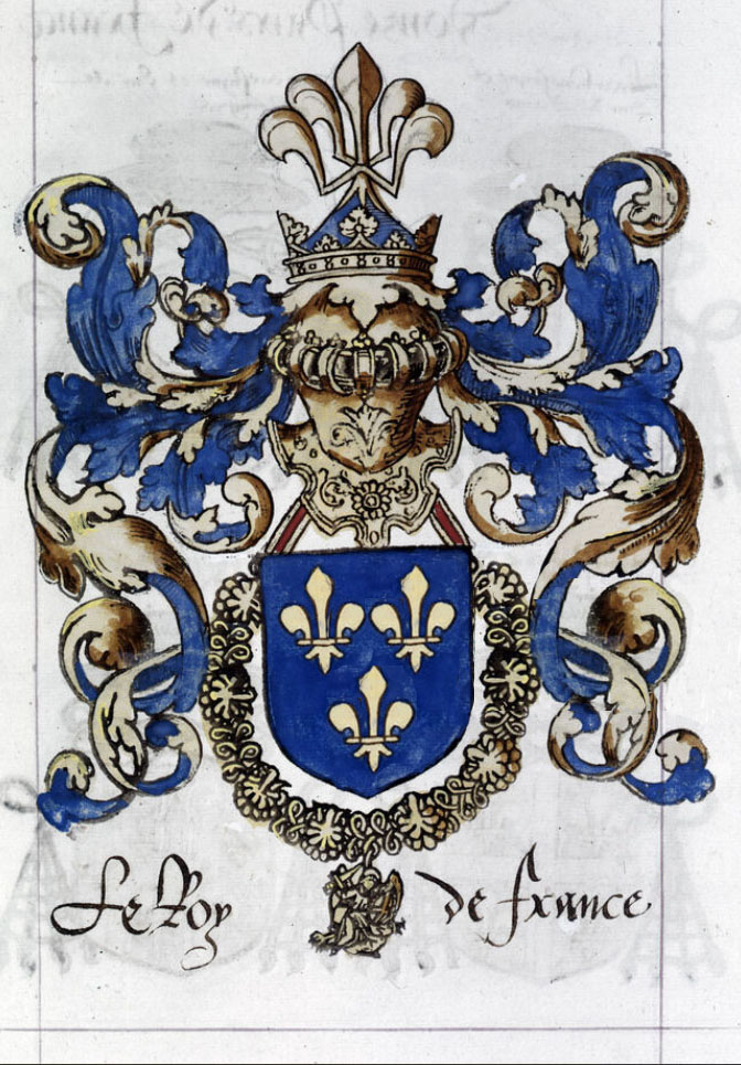 Au centre, un écu d’azur chargé de trois fleurs de lis d’or : François 1er a été sacré roi de France le 25 janvier 1515 dans la cathédrale de Reims. La fleur de lys, étroitement liée à la monarchie française, a été utilisée comme emblème royal pendant de nombreux siècles.