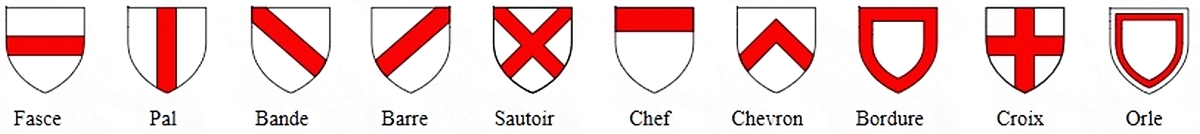 Les pièces “honorables” sont appelées ainsi parce qu’elles occupaient le rang le plus honorable dans l’écu porté par les plus nobles chevaliers. Ce sont la fasce, le pal, la bande, la barre, le sautoir, le chef, le chevron, la bordure, la croix, et l’orle.